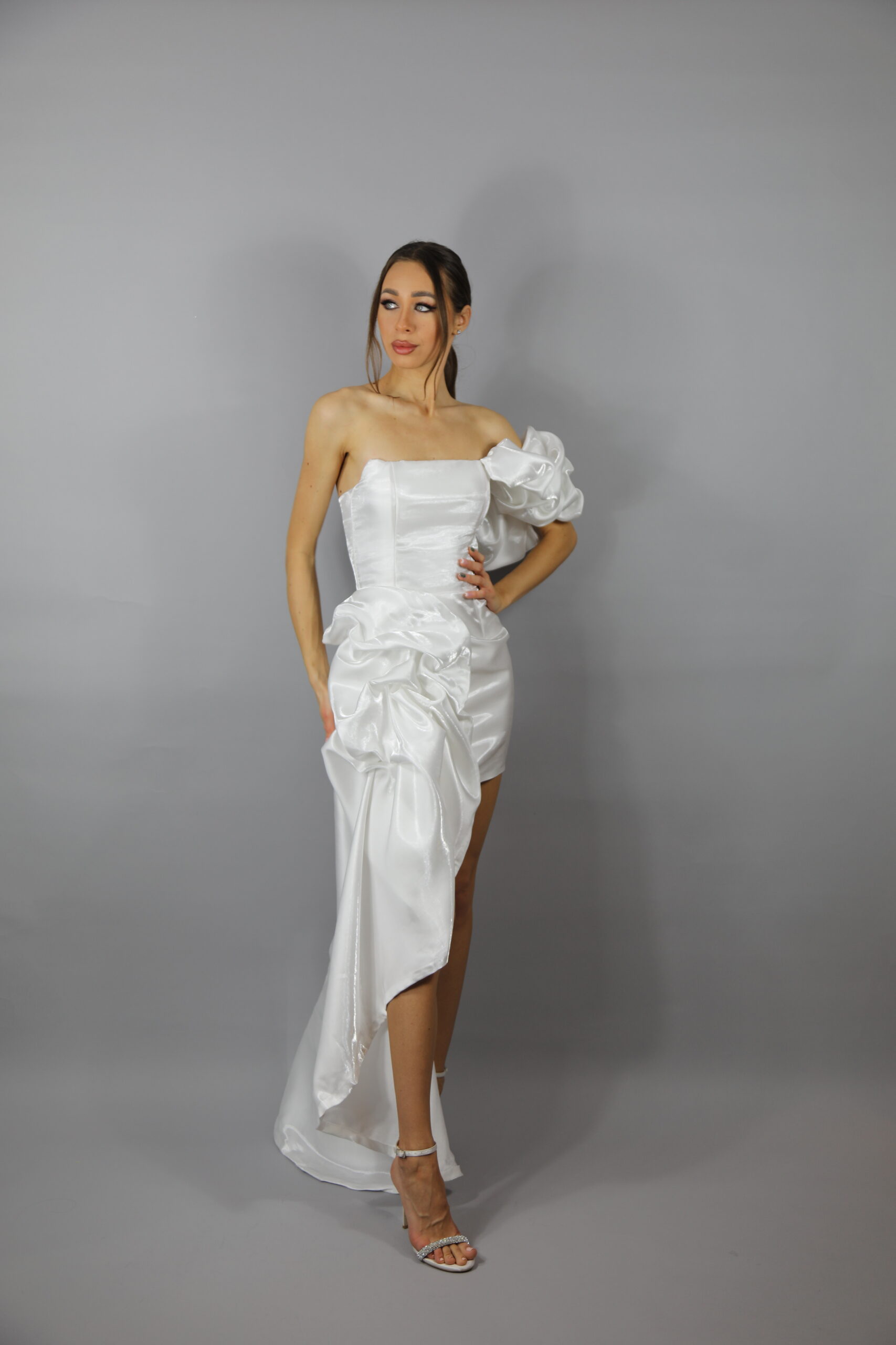 În partea de jos, modelul este completat de un drapaj asimetric pe o parte. Acesta creează un efect spectaculos și adaugă fluiditate mișcării. Datorită acestui design, această rochie albă atrage privirile și oferă un aer sofisticat.