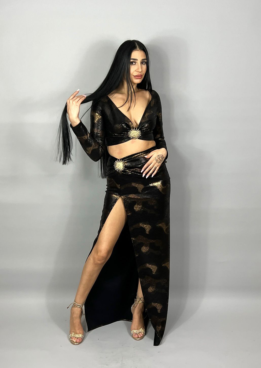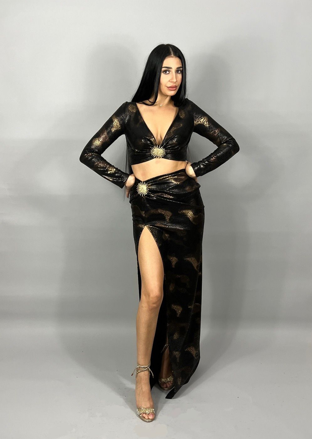 Un design care emană forță și senzualitate. Setul negru metalizat atrage privirile prin croiala sculpturală și detaliile aurii care accentuează talia. Textura cu reflexe metalice creează un joc de lumină subtil, perfect pentru seri în care eleganța capătă atitudine. Topul cu decolteu adânc și fusta lungă cu deschidere pe piciorul drept alungesc silueta. Închiderea fustei se face la spate cu fermoar, iar la top cu nasturi.